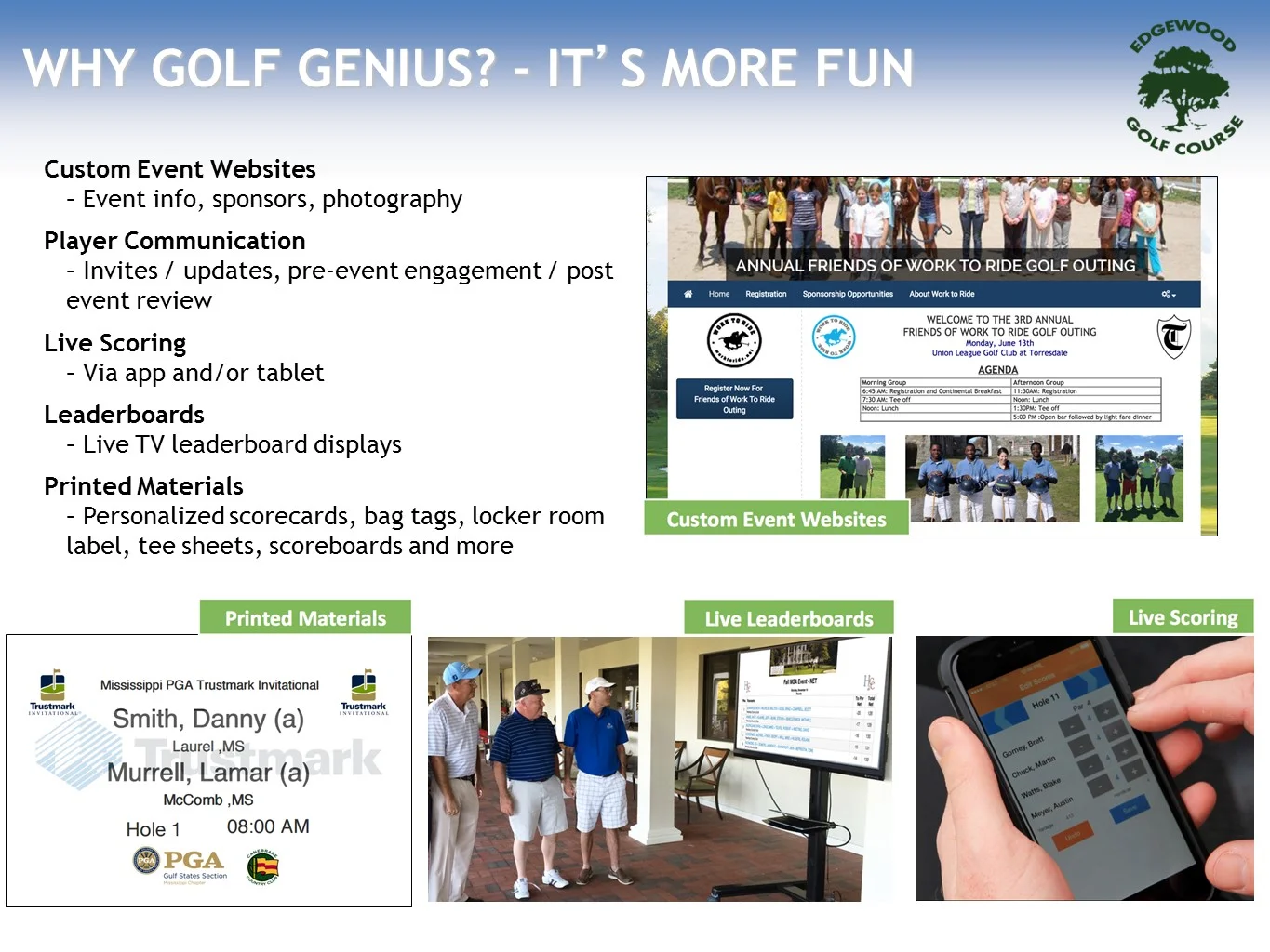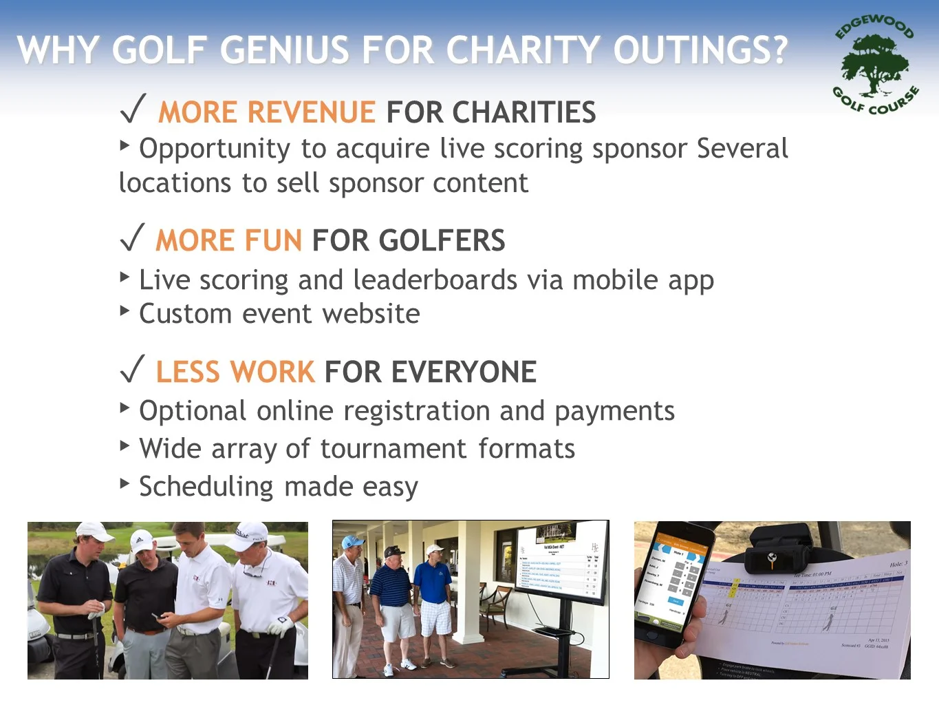 Our Professional Team at Edgewood Golf Course is committed to the success of your event. From the planning, implementation and final wrap-up, we are here to serve you. We offer a variety of complete hassle free event packages to choose from or we will customize one to fit your specific needs.